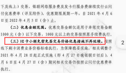 文章導讀:昨天晚上到今天上午,陸續收到了其他的材料,證實該傳聞的真實性越來越大。據業內人士爆出的內部文件顯示,為進一步促進云閃付業務的推廣,稱4.28日將正式取消芯片卡閃付1000以內雙免0.38%費率優惠,即IC卡小額雙免優惠不在展期!