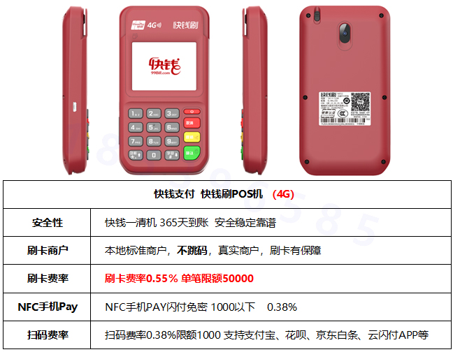快錢刷POS機刷卡費率0.55%正常到賬不加3,支持NFC手機Pay閃付免密0.38%的費率,支持掃碼費率0.38%,掃碼單筆限額1000。