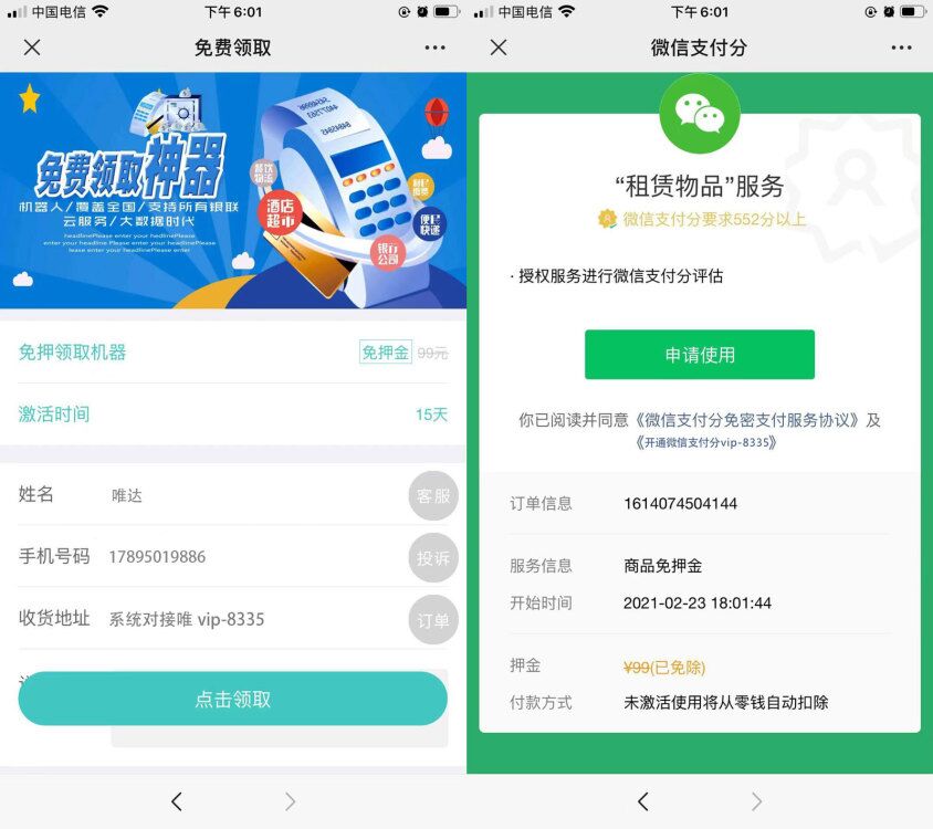 依托微信支付分信用體系,激活即視為歸還,信用服務完成。未激活,微信信用服務則顯示進行中,合作商家可借此督促用戶激活,為了不影響芝麻信用,用戶激活率可達95%以上。如果用戶在規定的時間內(如20天)未激活或者機器遺失無法激活,我們后臺可直接操作扣除機器押金