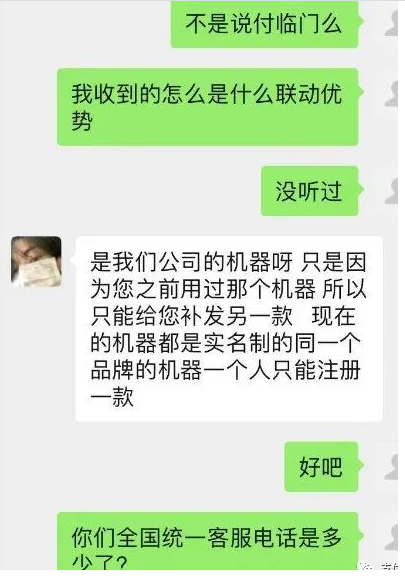 自稱客服和用戶聯(lián)系,說要郵寄付臨門的機(jī)器,收到的卻是聯(lián)動(dòng)優(yōu)勢的機(jī)器。客服解釋同一個(gè)品牌的機(jī)器一個(gè)人只能注冊一款!