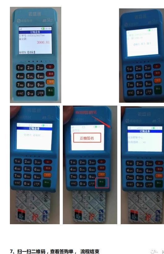6機器激活操作流程:機器按紅色按鍵開機會自動更新參數后,簽到01 密碼0000 →主頁面選1訂購業務→輸入金額(商戶首次用本人信用卡刷卡≥3000元視為激活)→輸入密碼,刷卡(每一張卡首次交易都需要插卡/刷卡后才可以進行閃付)