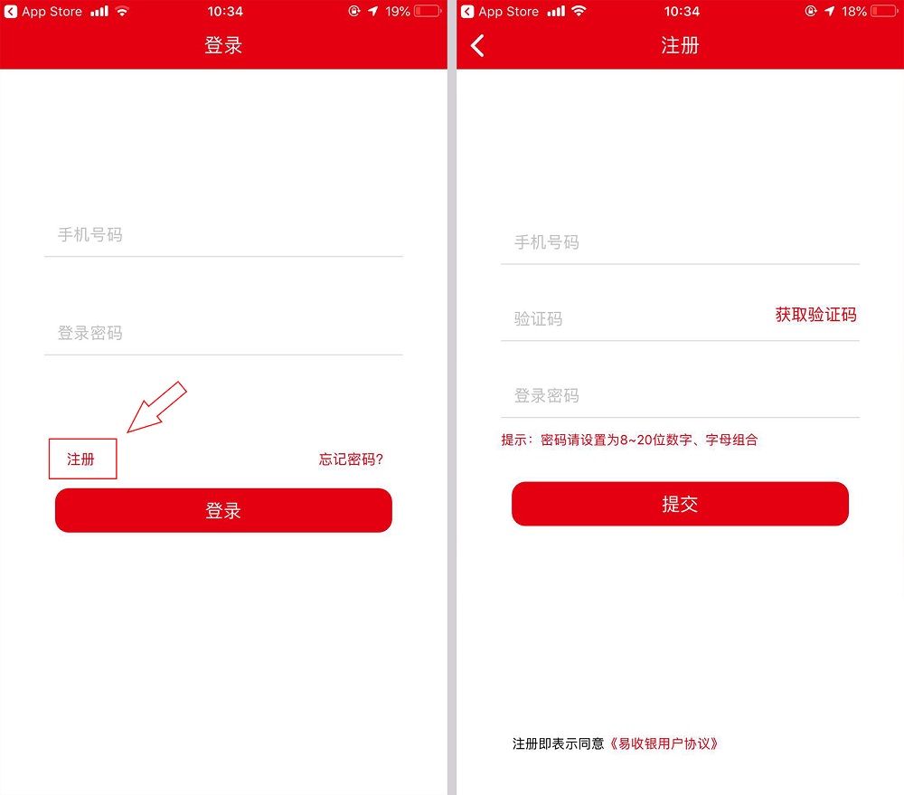 打開(kāi)易收銀APP點(diǎn)擊注冊(cè) 進(jìn)入注冊(cè)界面 進(jìn)行注冊(cè)